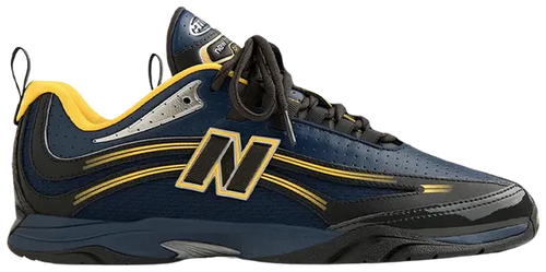 The upper features a deep navy mono mesh base, overlaid with perforated leather for added depth and texture. Glossy black patent leather reinforces the toe cap, while contrasting yellow arcs trace along the black leather midfoot overlay, offering dynamic visual movement. A floral ALD Queens crest is embroidered onto the heel, emphasizing the New York label's heritage-inspired storytelling. Underfoot, a FuelCell midsole delivers responsive cushioning, designed for all-day urban wear.