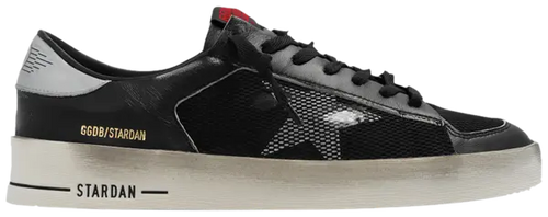 The Golden Goose Stardan 'Black Silver' reinterprets vintage basketball heritage through a distinctly distressed, streetwear-driven lens. This Italian-made low-top silhouette is defined by a sleek black mesh upper, contrasted with metallic silver leather overlays that deliver a sharp visual punch. Signature Golden Goose distressing throughout the outsole and heel tab gives the sneaker its worn-in, timeworn character—part of the brand’s philosophy of imperfection as identity.