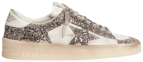 The Golden Goose Wmns Stardan 'White Silver Glitter' (SKU: GWF00128 F002185 80185) blends vintage athletic style with signature Golden Goose glamour. Designed with a distressed aesthetic, the sneaker features a white leather base adorned with all-over silver glitter panels, capturing the perfect balance between casual wear and statement sparkle.
