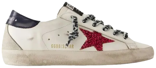Elements like the blue glitter star patch and fuchsia heel tab add expressive flair to Golden Goose's classic Superstar design.
