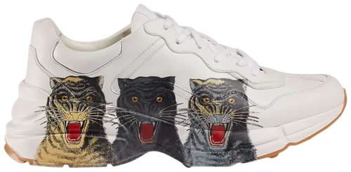 The Gucci Rhyton 'Tigers' sneaker showcases the brand’s signature chunky silhouette with an eye-catching tiger graphic, symbolizing strength and power. Made from premium leather, this sneaker blends luxury craftsmanship with bold streetwear aesthetics, making it a standout piece in any collection.