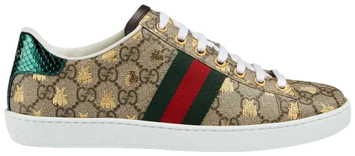 The Gucci Wmns Ace GG Supreme 'Bees' features the brand's iconic GG Supreme canvas in beige and ebony, adorned with embroidered gold bee motifs—a nod to Gucci's archival 1970s iconography. Complemented by leather overlays and the classic green-red Web stripe, this low-top sneaker balances heritage elegance with casual sophistication. Anchored on a tonal rubber sole, the design delivers refined, everyday luxury crafted in Italy.