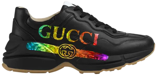 Bold and modern with a subtle futuristic twist, the Gucci Wmns Rhyton 'Iridescent Logo' reimagines the label's signature chunky sneaker silhouette in sleek black. Crafted from smooth black leather, the upper is accented by an iridescent Gucci logo that catches the light and shifts in color, delivering a dynamic visual contrast against the monochrome base.