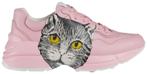 The Gucci Wmns Rhyton 'Mystic Cat - Light Pink' delivers a whimsical fusion of surrealist art and high-fashion streetwear. Designed with a blush-toned leather upper, the standout feature is a vintage-inspired feline graphic—Gucci’s enigmatic Mystic Cat—staring boldly from the lateral side. Evoking the charm of retro illustrations, the design speaks to Gucci’s continued embrace of fantastical iconography.
