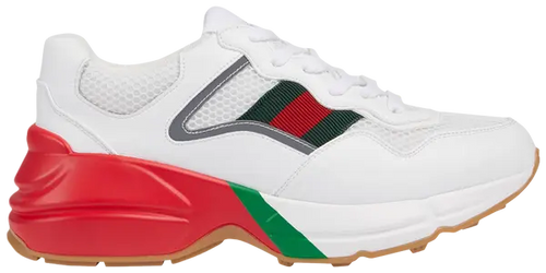 The Gucci Women's Rhyton 'White Red Green Reflective' offers a contemporary interpretation of the brand's celebrated chunky sneaker silhouette. This edition features a white mesh upper contrasted by bold reflective overlays that shimmer under light, enhancing visibility and futuristic appeal. A standout detail is the red and green webbing, a nod to Gucci's iconic house colors, integrated into the side panels for a signature flourish.