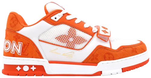 The Louis Vuitton Trainer Low 'Velcro Strap - Orange Monogram Denim'  brings bold color and luxurious texture to the silhouette first introduced under Virgil Abloh’s creative direction. Crafted in Italy, this rendition features a vibrant orange monogram denim set against smooth tonal leather overlays. The forefoot is secured by a prominent velcro strap, adding a modern twist to the classic low-top design.