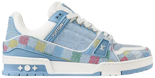 The Louis Vuitton Trainer 'Lvers Damier' arrives as a standout piece from the fashion house's late 2024 releases, blending high-end materials with a distinct streetwear influence. Crafted in Italy, the low-top silhouette features a denim upper in a rich blue hue, covered in a bold reinterpretation of the brand’s classic Damier check pattern. The signature motif is reimagined under the “Lvers” concept—Virgil Abloh’s love-themed monogram campaign that celebrates creative expression and individuality.