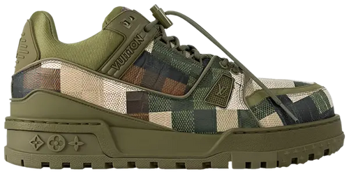 The Louis Vuitton Trainer Maxi 'Damoflage' delivers a bold reinterpretation of the brand’s iconic sneaker, infused with utilitarian edge and oversized proportions. Crafted in Italy from premium calf leather, this high-impact model features a striking green camouflage-inspired “Damoflage” pattern — a digital twist on the classic Damier check — across its layered upper.