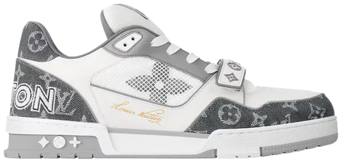 The Louis Vuitton Trainer 'Velcro Strap - Grey Monogram Denim' introduces a utilitarian twist on the Maison's iconic low-top silhouette. Made in Italy, this elevated sneaker combines tonal grey leather with Monogram-printed denim overlays, lending texture and depth to the design. A wide Velcro strap across the midfoot enhances lockdown while adding a bold stylistic element.