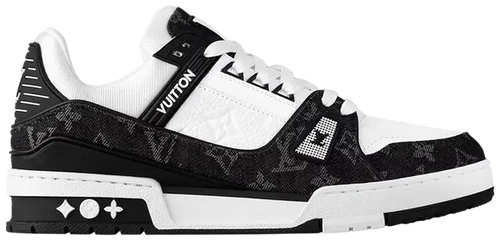 The Louis Vuitton Wmns Trainer 'Black Monogram Denim' 2023 brings a sleek, tonal take on the house’s iconic sneaker silhouette. Wrapped in black Monogram denim, this women’s edition exudes understated opulence while nodding to classic LV heritage. The upper’s textured jacquard pattern subtly showcases the maison's signature floral and LV logos, giving depth and visual intrigue without overpowering the minimalist palette.