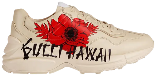 The Gucci Wmns Rhyton 'Gucci Hawaii Poppy Print' reimagines the brand’s signature chunky sneaker with a vibrant floral twist. Crafted in supple ivory leather, the upper is elevated by a vivid red “Hawaii” and poppy motif that evokes tropical getaways and sun-drenched style. Set atop the iconic oversized sole, this sneaker merges bold aesthetics with luxurious comfort.