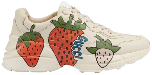 Playful yet fashion-forward, the Gucci Wmns Rhyton 'Gucci Strawberry' merges streetwear energy with the whimsical charm of Gucci's graphic motifs. The premium white leather upper serves as the canvas for an oversized strawberry illustration, complete with a bold "Gucci" script in pop-art styling.