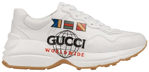 The Gucci Wmns Rhyton 'Worldwide' sneaker captures the spirit of global unity and luxury streetwear with bold, multicultural flair. Built on the iconic Rhyton silhouette, this edition features a smooth ivory-toned leather upper adorned with a vibrant “Gucci Worldwide” graphic rendered in a spectrum of colors. The design is grounded with a gum rubber sole, offering a vintage-inspired contrast that nods to classic 90s aesthetics.