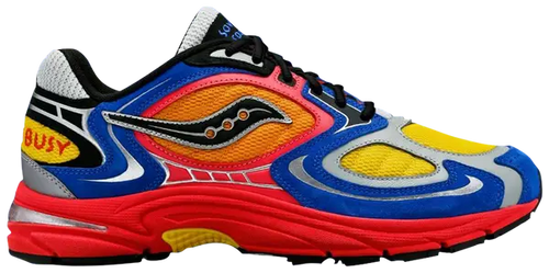 Product Overview: The Jae Tips x Saucony Grid Jazz 9 'I Love You But I'm Busy' brings vibrant and playful energy to a classic running silhouette. A multi-colored upper combines synthetic leather overlays in shades of blue, silver, pink, grey, and black, offering a dynamic and eye-catching design. The use of orange mesh side panels and yellow mesh at the toe box and heel adds layers of contrast, with the heel bearing the printed message 'I Love You But I'm Busy' for a quirky personal touch. Jae Tips' Savior branding on the tongue further enhances the collaboration's signature look. The sneaker sits on a dark pink foam midsole, balanced by a black rubber outsole for traction.