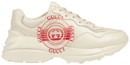 The Gucci Wmns Rhyton 'Gucci Disk Print - Ivory' brings retro aesthetics to the forefront of luxury streetwear. Crafted from soft ivory leather, the upper showcases a vintage-inspired Gucci disk graphic in bold red tones, nodding to the brand’s heritage and 1980s pop culture. The design sits atop Gucci’s signature chunky sole, offering both visual impact and comfortable wear.
