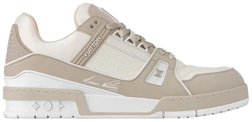 Understated luxury defines the Louis Vuitton Trainer Sneaker 'Beige', part of the Fall 2024 collection. Made in Italy from supple calf leather, this refined low-top is rendered in a soft beige tone that underscores its clean, minimalist aesthetic. The tonal palette emphasizes the sneaker’s silhouette, designed by Virgil Abloh and inspired by vintage basketball shoes.