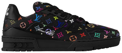 The Takashi Murakami x Louis Vuitton Wmns Trainer 'Black' 2025 embodies the whimsical vision of one of Japan's most influential artists, translated through the lens of Louis Vuitton’s signature craftsmanship. This Made-in-Italy edition of the women's low-top sneaker dresses the silhouette in black calf leather, enhanced by a kaleidoscopic reinterpretation of the classic Louis Vuitton monogram.